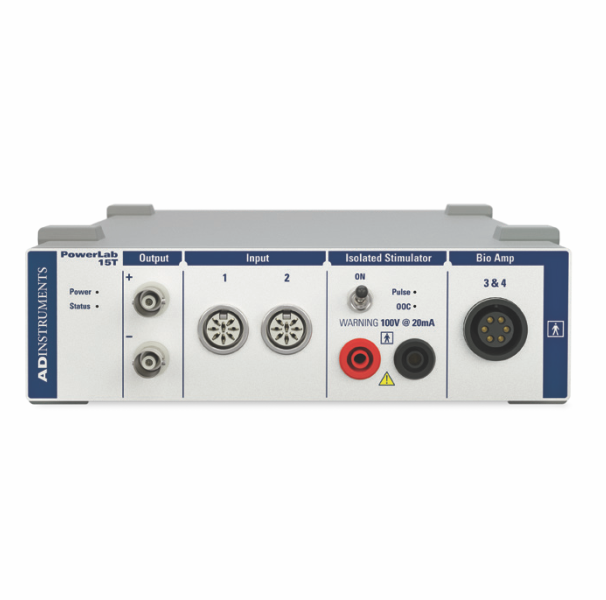 The T Series PowerLab is an economically priced high quality DAQ unit with built-in, fully isolated, two-channel bio amplifier, isolated stimulator, separate non-isolated analog inputs, and a differential-mode analog output.
